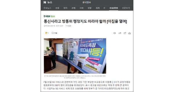 7월 31일 5G 서비스와 관련하여 거짓·과장·기만·부당한 비교광고로 이동통신 3사가 공정거래위원회로부터 336억 원의 과징금을 부과받았다. 표시·광고법 위반으로는 …