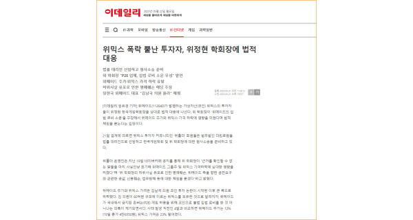 위메이드, 위믹스 투자자들, 위정현 학회장에 법적대응 '착수'