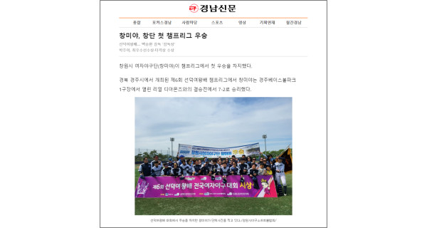 창원시 여자야구단(창미야)이 챔프리그에서 첫 우승을 차지했다. 경북 경주시에서 개최된 제6회 선덕여왕배 챔프리그에서 창미야는 경주베이스볼파크 1구장에서 열린…